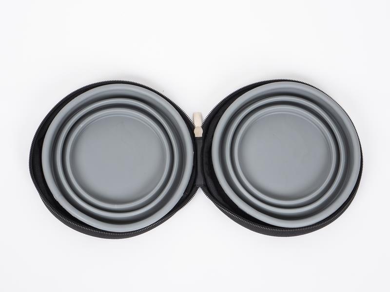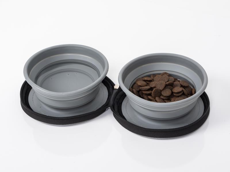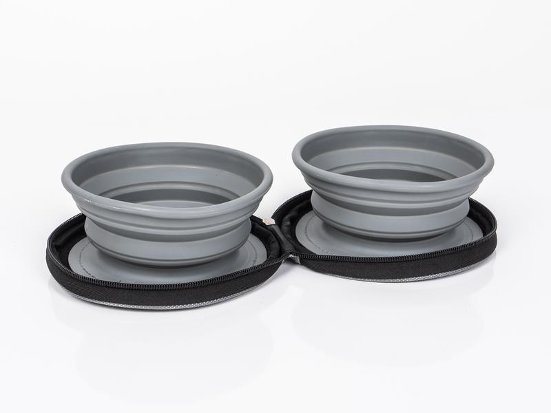 Perfekt für unterwegs: 2 faltbare Silikonnäpfe, die in einer praktischen Reißverschlusstasche mit Klettverschluss befestigt und abnehmbar sind.
