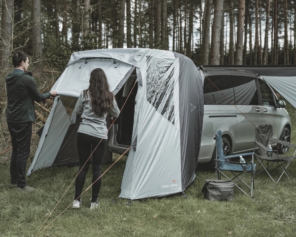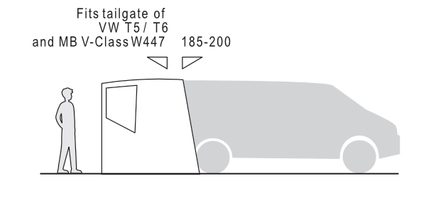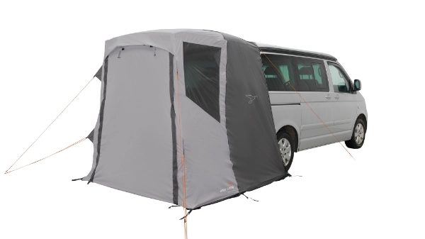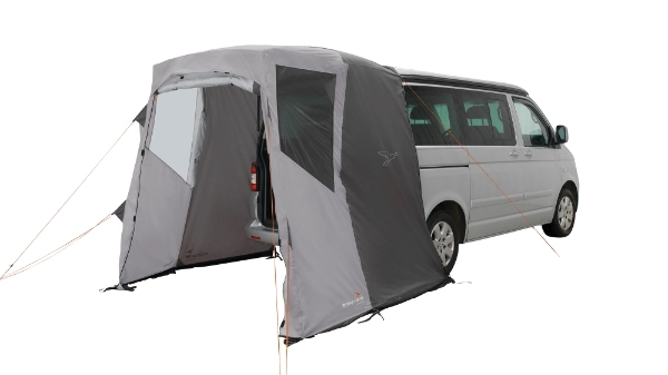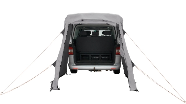 Krossbu ist ein vielseitiges Heckklappenzelt, das zusätzlichen flexiblen Raum für Wohnmobile bietet. Es wird sicher an der Heckklappe mit doppelten Abspannleinen befestigt und verfügt über eine fixierbare Tür, die entweder aufgerollt werden kann und eine Höhe hat, die einen leichten Zugang ermöglicht, oder als Sonnensegel verwendet werden kann, um zusätzlichen Schutz vor Sonne und Regen zu bieten.
